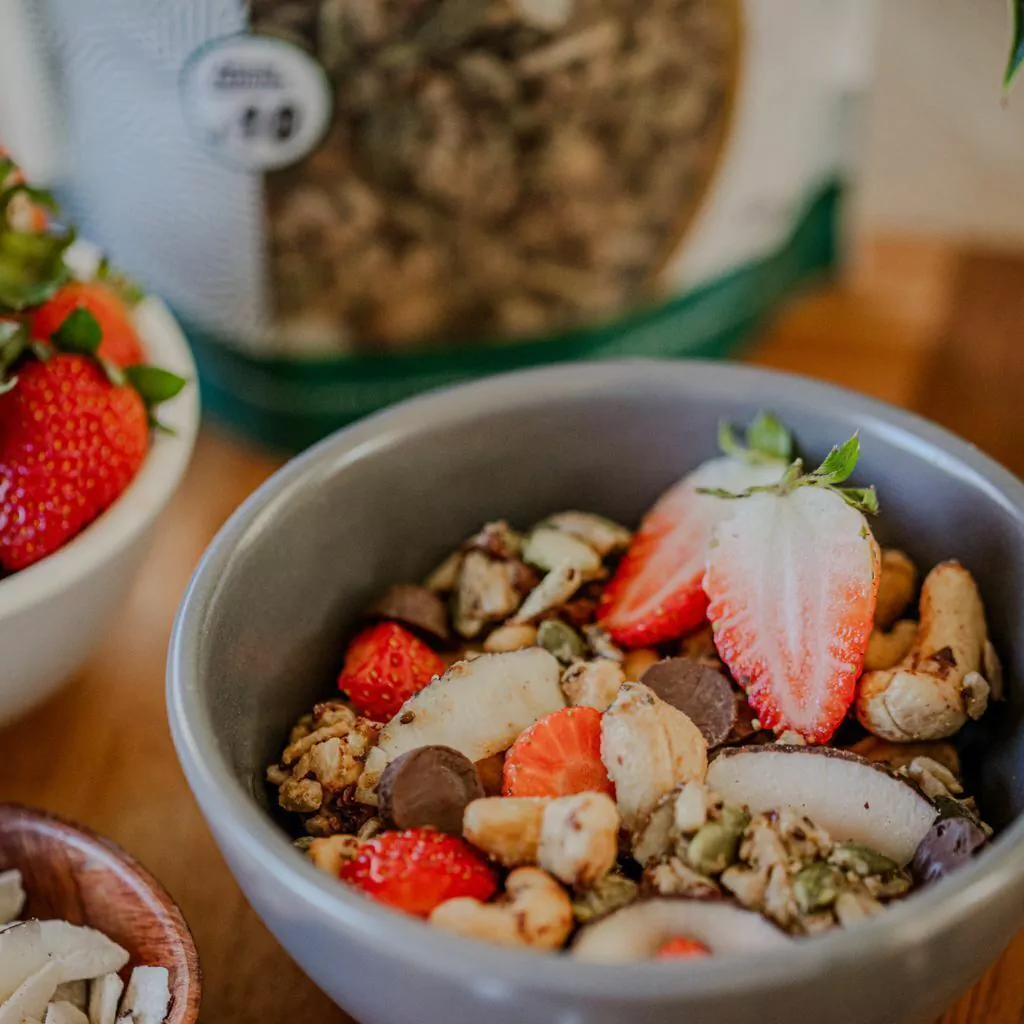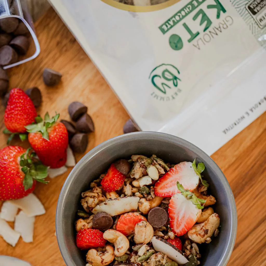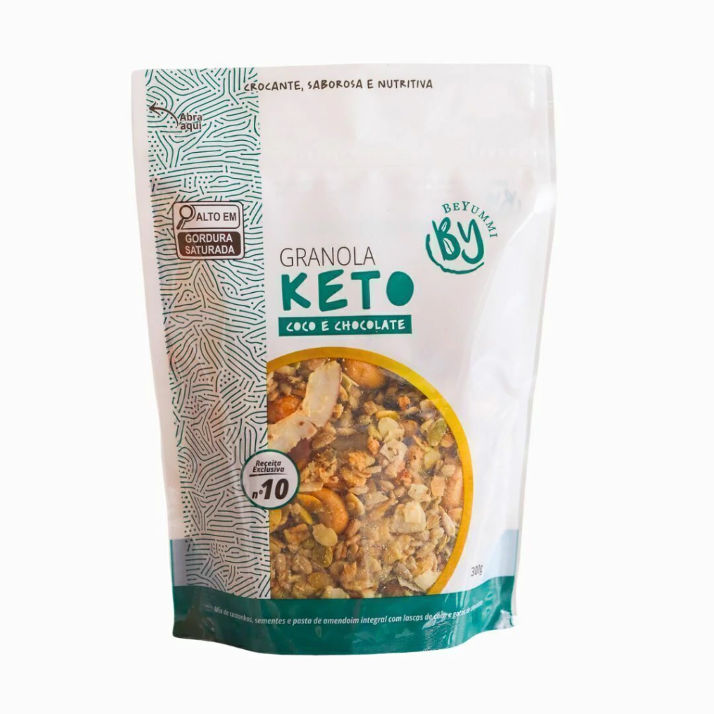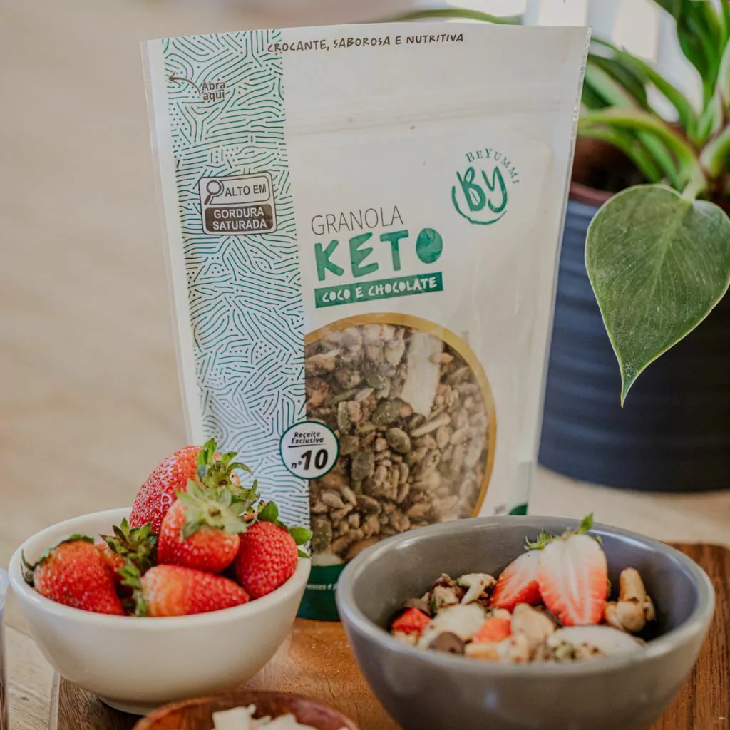 A Granola BY KETO Coco & Chocolate é produzida de forma artesanal, a base de castanhas e sementes, com um toque exclusivo e delicioso de pasta de amendoim, lascas generosas de coco in natura e gotinhas de chocolate belga amargo. É crocante e saborosa, cetogênica, plant basead e sem aveia.